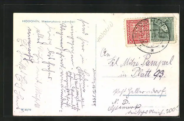 Personenbezogene Daten auf der Rückseite der Karte wurden durch blauen Textmarker unkenntlich gemacht. Die blauen Stellen sind auf die Vorderseite durchgeweicht und wirken sich negativ auf das Postkartenfoto aus