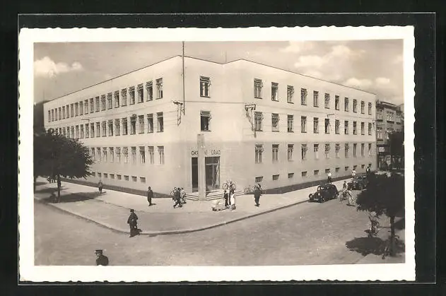 AK Göding / Hodonin, Okresni urad, Strassenpartie mit Passanten