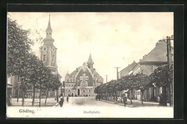 AK Göding / Hodonin, Stadtplatz mit Blick aufs Rathaus
