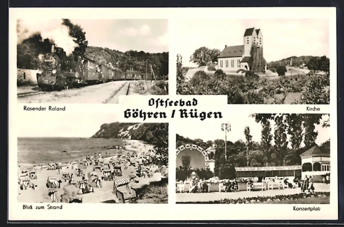 AK Göhren /Rügen, Rasender Roland, Kirche, Konzertplatz, Strand
