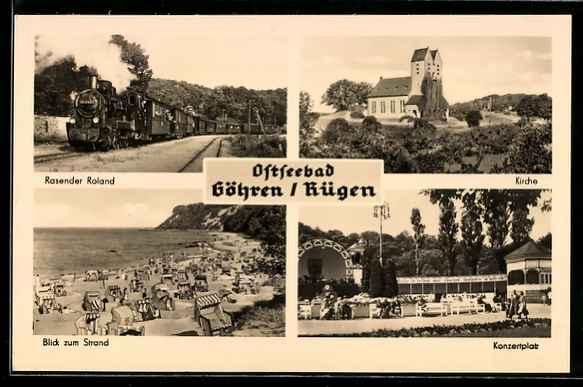 AK Göhren /Rügen, Rasender Roland, Kirche, Konzertplatz, Strand