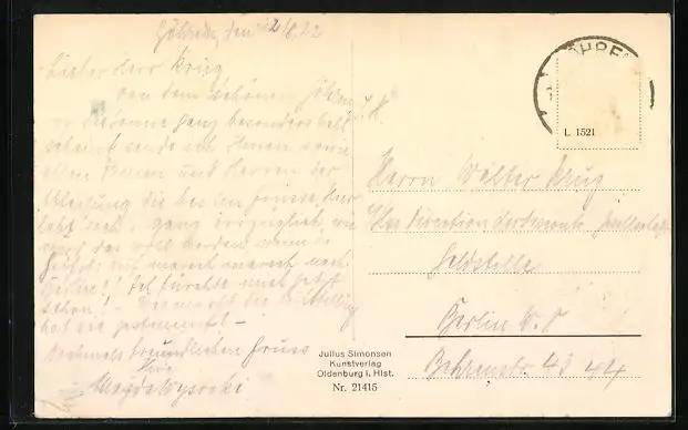 alte Ansichtskarte, gelaufen 1922, Briefmarke entfernt, guter Zustand