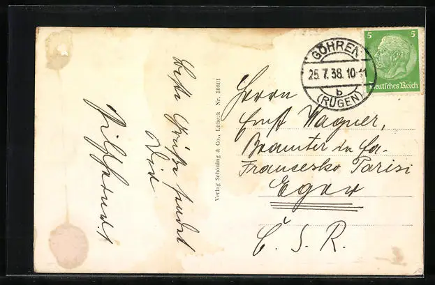 gelaufen 1938, rückseitig Klebe- und Papierreste, guter Zustand