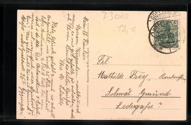Personenbezogene Daten auf der Rückseite der Karte wurden durch blauen Textmarker unkenntlich gemacht. Die blauen Stellen sind auf die Vorderseite durchgeweicht und wirken sich negativ auf das Postkartenfoto aus