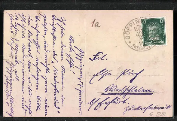Personenbezogene Daten auf der Rückseite der Karte wurden durch blauen Textmarker unkenntlich gemacht. Die blauen Stellen sind auf die Vorderseite durchgeweicht und wirken sich negativ auf das Postkartenfoto aus
