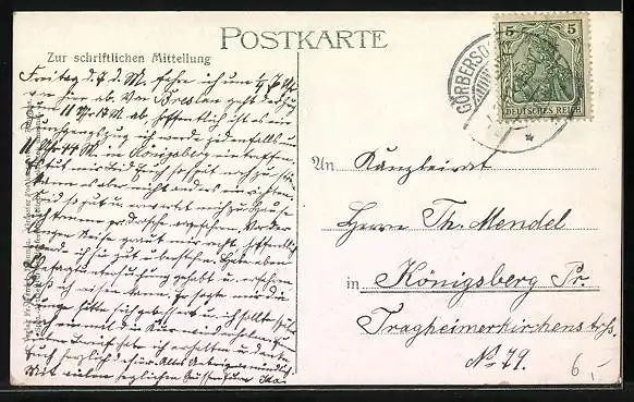 Personenbezogene Daten auf der Rückseite der Karte wurden durch blauen Textmarker unkenntlich gemacht. Die blauen Stellen sind auf die Vorderseite durchgeweicht und wirken sich negativ auf das Postkartenfoto aus