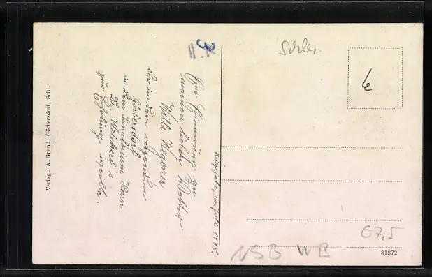 Personenbezogene Daten auf der Rückseite der Karte wurden durch blauen Textmarker unkenntlich gemacht. Die blauen Stellen sind auf die Vorderseite durchgeweicht und wirken sich negativ auf das Postkartenfoto aus