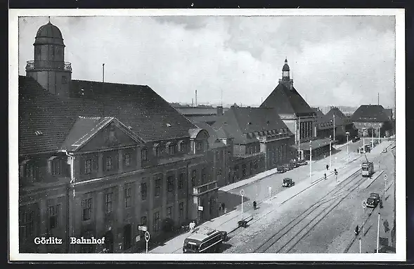 AK Görlitz, Bahnhof mit Strassenbahn