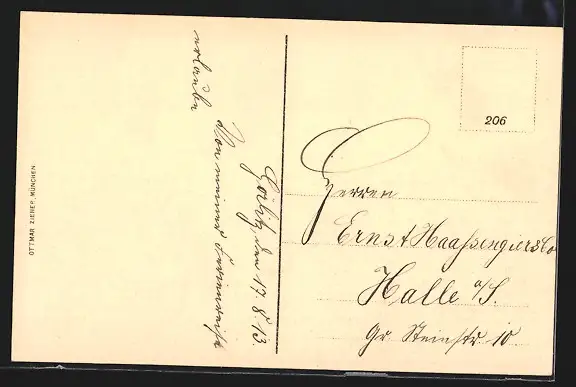 Personenbezogene Daten auf der Rückseite der Karte wurden durch blauen Textmarker unkenntlich gemacht. Die blauen Stellen sind auf die Vorderseite durchgeweicht und wirken sich negativ auf das Postkartenfoto aus