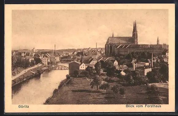 AK Görlitz, Blick vom Forsthaus mit Kirche