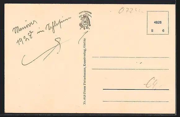Personenbezogene Daten auf der Rückseite der Karte wurden durch blauen Textmarker unkenntlich gemacht. Die blauen Stellen sind auf die Vorderseite durchgeweicht und wirken sich negativ auf das Postkartenfoto aus