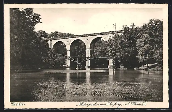 AK Görlitz, Neissepartie mit Laufsteg und Viadukt