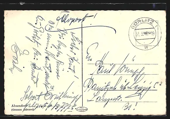 Personenbezogene Daten auf der Rückseite der Karte wurden durch blauen Textmarker unkenntlich gemacht. Die blauen Stellen sind auf die Vorderseite durchgeweicht und wirken sich negativ auf das Postkartenfoto aus