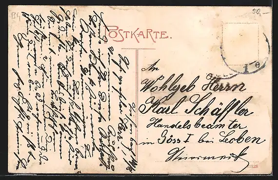 Personenbezogene Daten auf der Rückseite der Karte wurden durch blauen Textmarker unkenntlich gemacht. Die blauen Stellen sind auf die Vorderseite durchgeweicht und wirken sich negativ auf das Postkartenfoto aus