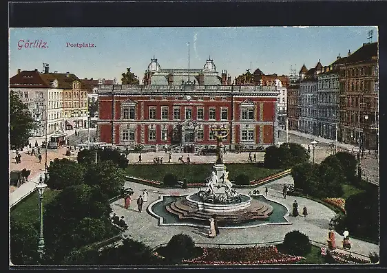 AK Görlitz, Postplatz mit Postgebäude und Strassenbahn