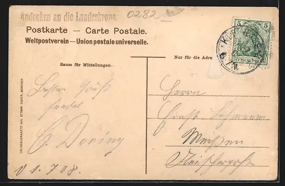 alte Ansichtskarte, gelaufen 1908, rückseitig Oberflächenschaden, guter Zustand