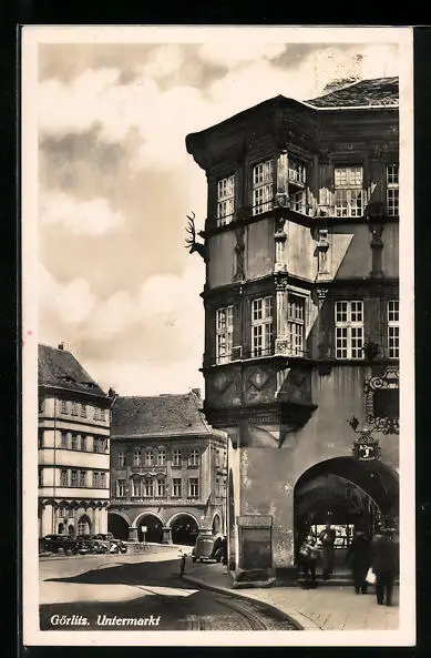 AK Görlitz, am Untermarkt mit Passanten und Autos