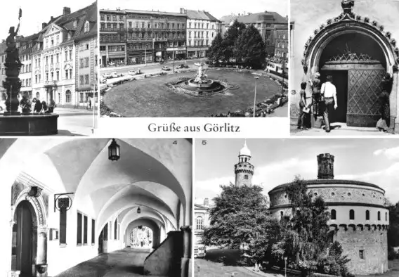 Ansichtskarte Görlitz fünf Abb. - Görlitzinformation am Leninplatz, Platz der Befreiung, "Flüsterbogen" am Untermarkt, "Lange Läuben" am Untermarkt, Kaisertrutz Erhaltung I-II ungelaufen Druckvermerk: 1982 Herstellungsland: DDR Verlag: VEB Bild und Heimat, Reichenbach i. V. - 01 12 32 132