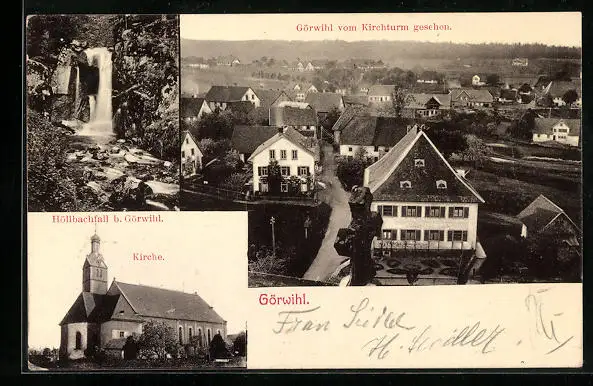 AK Görwihl, Ortsansicht vom Kirchturm, Höllbachfall und Kirche
