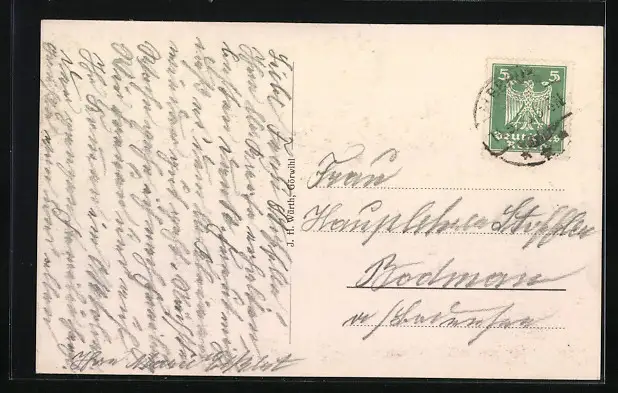 Personenbezogene Daten auf der Rückseite der Karte wurden durch blauen Textmarker unkenntlich gemacht. Die blauen Stellen sind auf die Vorderseite durchgeweicht und wirken sich negativ auf das Postkartenfoto aus