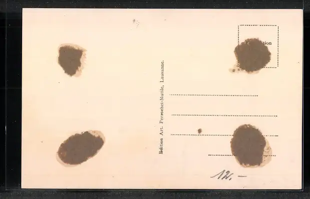 Personenbezogene Daten auf der Rückseite der Karte wurden durch blauen Textmarker unkenntlich gemacht. Die blauen Stellen sind auf die Vorderseite durchgeweicht und wirken sich negativ auf das Postkartenfoto aus