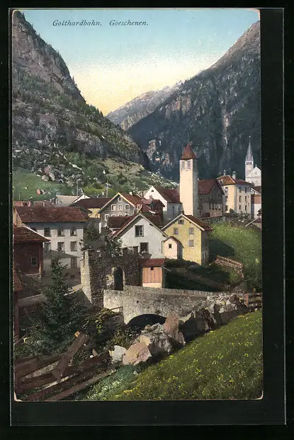 AK Goeschenen, Dorfpartie vor Bergpanorama