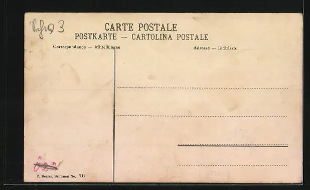 Personenbezogene Daten auf der Rückseite der Karte wurden durch blauen Textmarker unkenntlich gemacht. Die blauen Stellen sind auf die Vorderseite durchgeweicht und wirken sich negativ auf das Postkartenfoto aus
