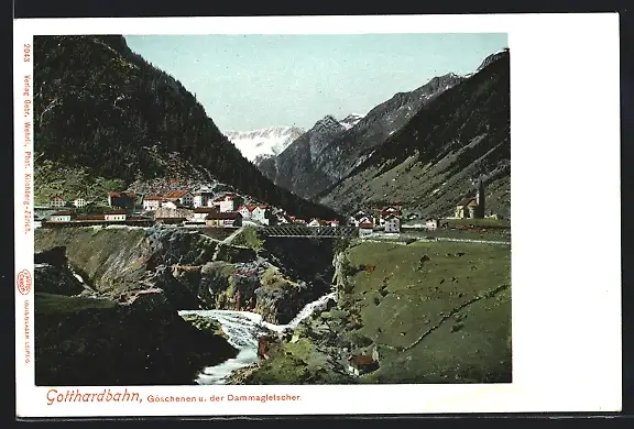 AK Göschenen, Ortsansicht mit dem Dammagletscher und der Gotthardbahn