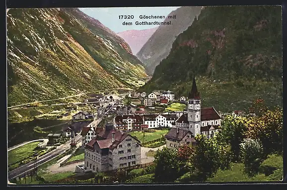 AK Göschenen, Ortspartie mit Kirchen und dem Gotthardtunnel