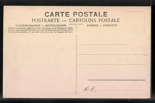 Personenbezogene Daten auf der Rückseite der Karte wurden durch blauen Textmarker unkenntlich gemacht. Die blauen Stellen sind auf die Vorderseite durchgeweicht und wirken sich negativ auf das Postkartenfoto aus