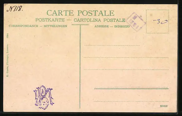 Personenbezogene Daten auf der Rückseite der Karte wurden durch blauen Textmarker unkenntlich gemacht. Die blauen Stellen sind auf die Vorderseite durchgeweicht und wirken sich negativ auf das Postkartenfoto aus