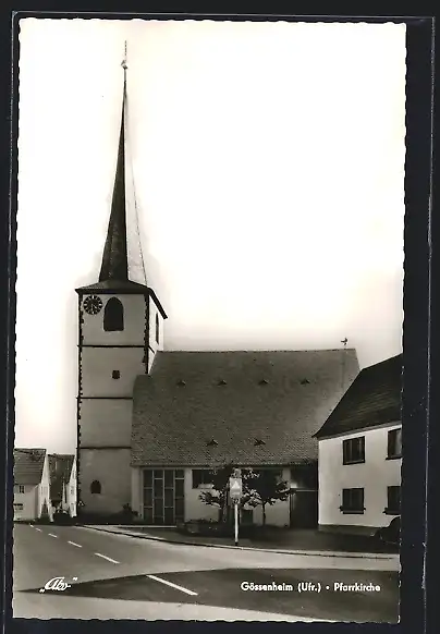 AK Gössenheim /Ufr., Strassenpartie mit Pfarrkirche