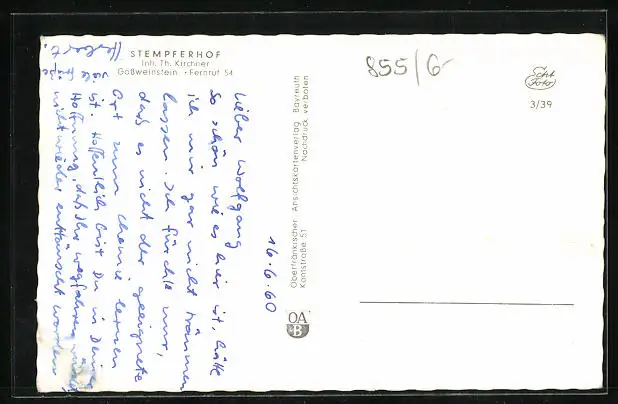 Personenbezogene Daten auf der Rückseite der Karte wurden durch blauen Textmarker unkenntlich gemacht. Die blauen Stellen sind auf die Vorderseite durchgeweicht und wirken sich negativ auf das Postkartenfoto aus