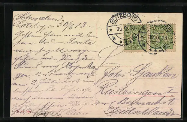 Personenbezogene Daten auf der Rückseite der Karte wurden durch blauen Textmarker unkenntlich gemacht. Die blauen Stellen sind auf die Vorderseite durchgeweicht und wirken sich negativ auf das Postkartenfoto aus
