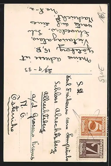 Personenbezogene Daten auf der Rückseite der Karte wurden durch blauen Textmarker unkenntlich gemacht. Die blauen Stellen sind auf die Vorderseite durchgeweicht und wirken sich negativ auf das Postkartenfoto aus