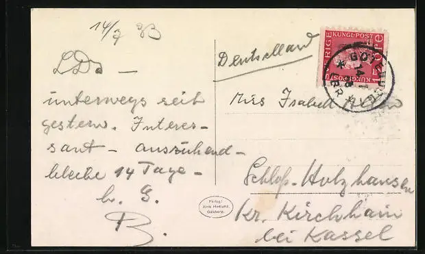 Personenbezogene Daten auf der Rückseite der Karte wurden durch blauen Textmarker unkenntlich gemacht. Die blauen Stellen sind auf die Vorderseite durchgeweicht und wirken sich negativ auf das Postkartenfoto aus