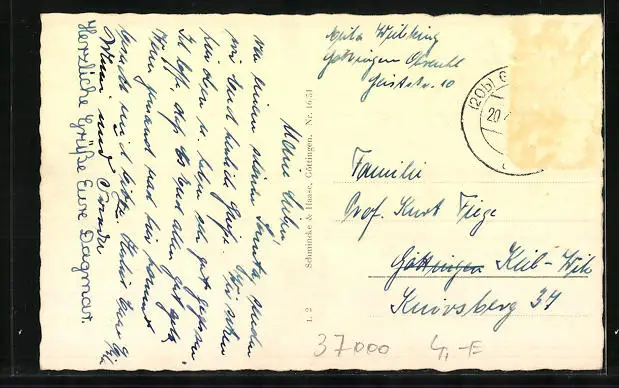 Personenbezogene Daten auf der Rückseite der Karte wurden durch blauen Textmarker unkenntlich gemacht. Die blauen Stellen sind auf die Vorderseite durchgeweicht und wirken sich negativ auf das Postkartenfoto aus