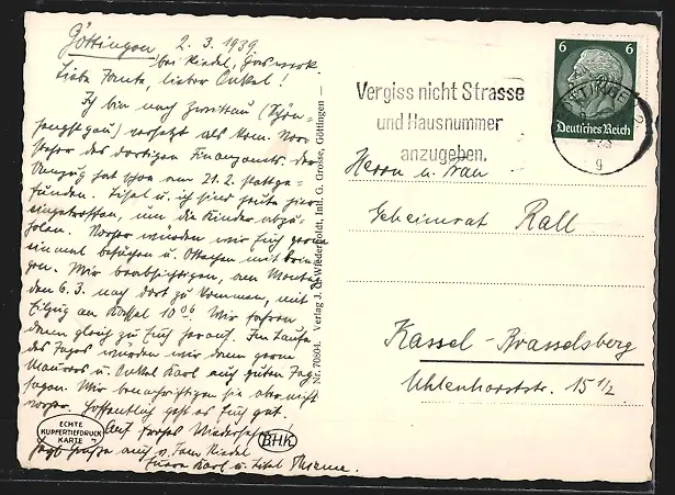 gelaufen 1939, Eckknick li. oben, Stempelspur, guter Zustand