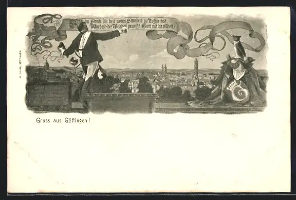 AK Göttingen, Student mit Wappen und Eule am Stadtrand