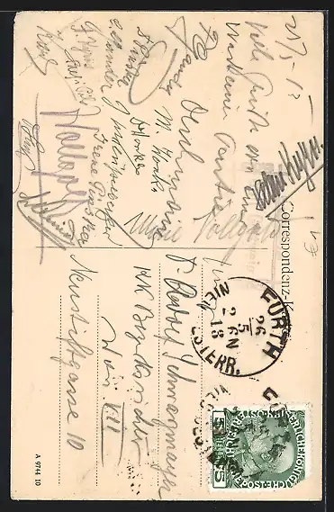 alte Ansichtskarte, gelaufen 1913, Eckknick mit Abriebspur re. oben