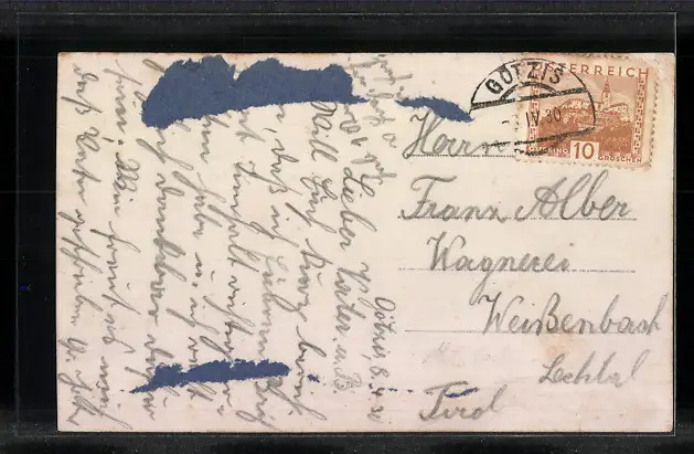 Personenbezogene Daten auf der Rückseite der Karte wurden durch blauen Textmarker unkenntlich gemacht. Die blauen Stellen sind auf die Vorderseite durchgeweicht und wirken sich negativ auf das Postkartenfoto aus