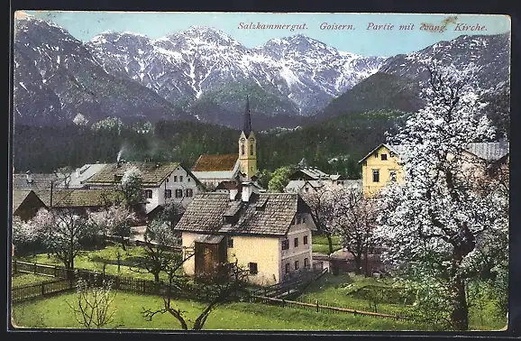 AK Goisern, Partie an der evang. Kirche im Frühling