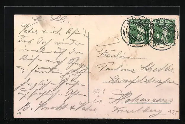Personenbezogene Daten auf der Rückseite der Karte wurden durch blauen Textmarker unkenntlich gemacht. Die blauen Stellen sind auf die Vorderseite durchgeweicht und wirken sich negativ auf das Postkartenfoto aus