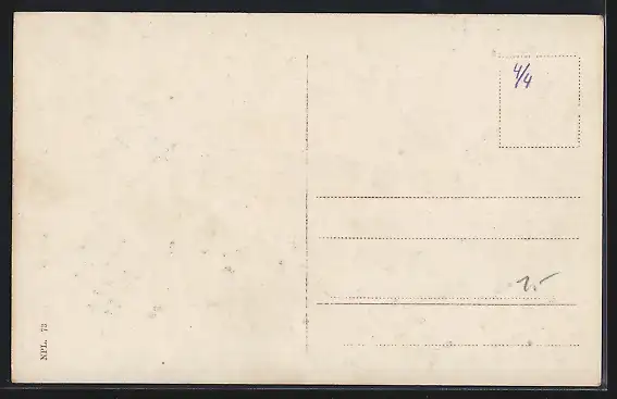 Personenbezogene Daten auf der Rückseite der Karte wurden durch blauen Textmarker unkenntlich gemacht. Die blauen Stellen sind auf die Vorderseite durchgeweicht und wirken sich negativ auf das Postkartenfoto aus