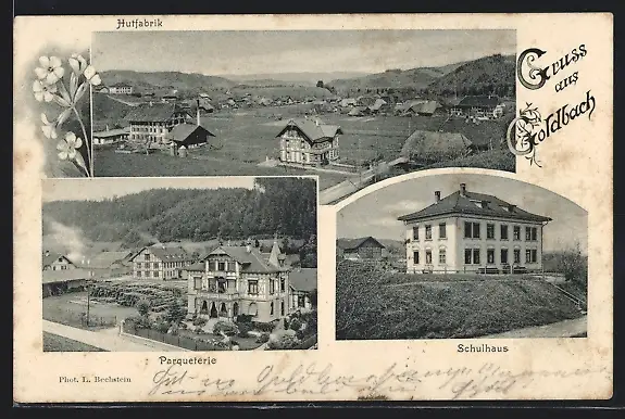 AK Goldbach, Parqueterie, Schulhaus, Hutfabrik