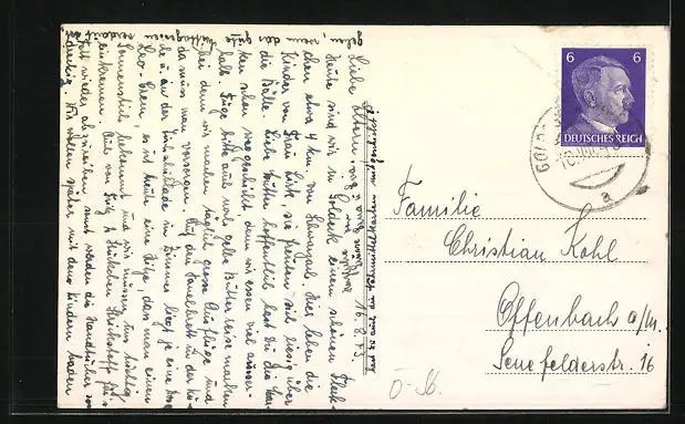 Personenbezogene Daten auf der Rückseite der Karte wurden durch blauen Textmarker unkenntlich gemacht. Die blauen Stellen sind auf die Vorderseite durchgeweicht und wirken sich negativ auf das Postkartenfoto aus
