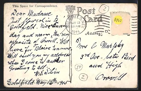 gelaufen 1915, Briefmarke entfernt, rückseitig Oberflächenschaden, Ecken bestoßen, Eckknick re. oben, guter Zustand