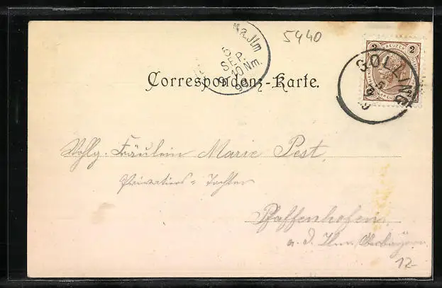 Personenbezogene Daten auf der Rückseite der Karte wurden durch blauen Textmarker unkenntlich gemacht. Die blauen Stellen sind auf die Vorderseite durchgeweicht und wirken sich negativ auf das Postkartenfoto aus