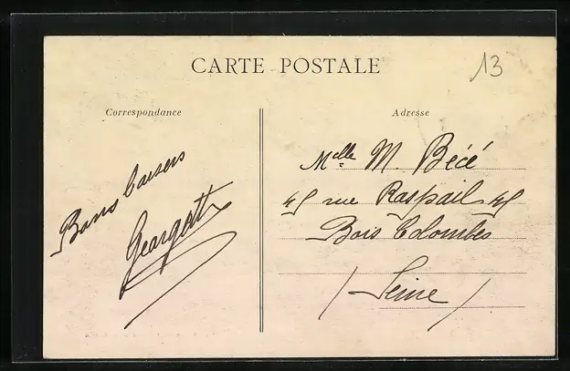 Personenbezogene Daten auf der Rückseite der Karte wurden durch blauen Textmarker unkenntlich gemacht. Die blauen Stellen sind auf die Vorderseite durchgeweicht und wirken sich negativ auf das Postkartenfoto aus