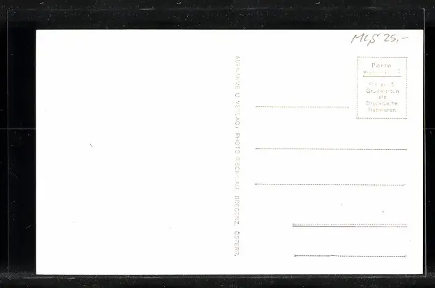 Personenbezogene Daten auf der Rückseite der Karte wurden durch blauen Textmarker unkenntlich gemacht. Die blauen Stellen sind auf die Vorderseite durchgeweicht und wirken sich negativ auf das Postkartenfoto aus